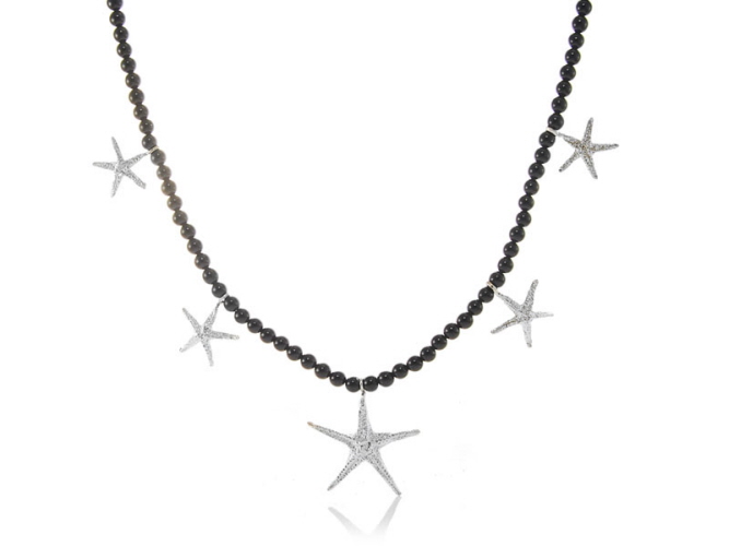 Die tragende Struktur dieser Hand-gefertigten Kette ist aus einem extrem widerstandsfähigen, weichen Draht gemacht, welcher die Türkiskügelchen mit den Seesternen "Circe" (Silber 925 rhodiniert) verbindet. Ein klassisches, filigranes Juwel zu jedem Outfit und Anlass passend.