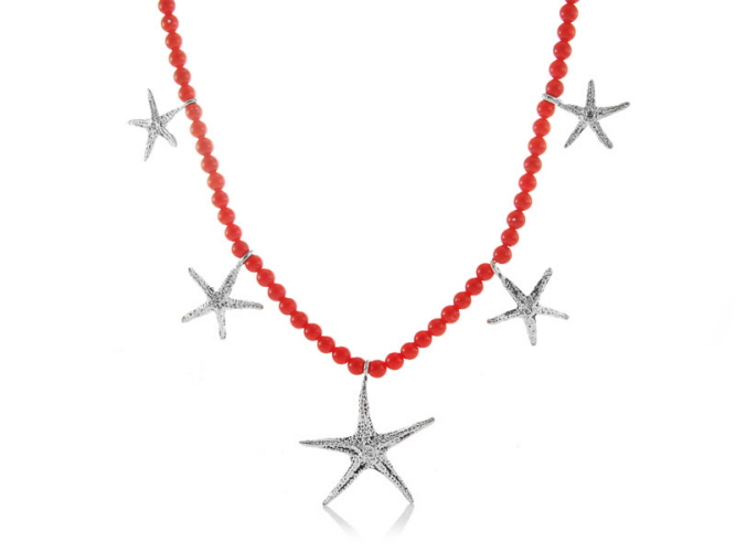 Die tragende Struktur dieser handgefertigten Kette ist aus einem extrem widerstandsfähigen, weichen Draht gemacht, welcher die roten Korallenkugeln mit den Seesternen "Circe" (Silber 925 rhodiniert) verbindet. Ein klassisches, filigranes Juwel zu jedem Outfit und Anlass passend.